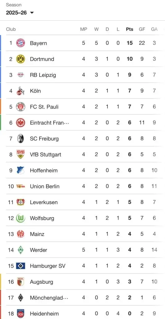With this win, Bayern now sit on 15 points from 5 matches the only team with a perfect record. Dortmund and RB Leipzig trail with 10 points and 9 points respectively, having played one fewer game. Köln and FC St. Pauli round out the top five with 7 points apiece. Werder, after this loss, drop to 14th with just 5 points.
