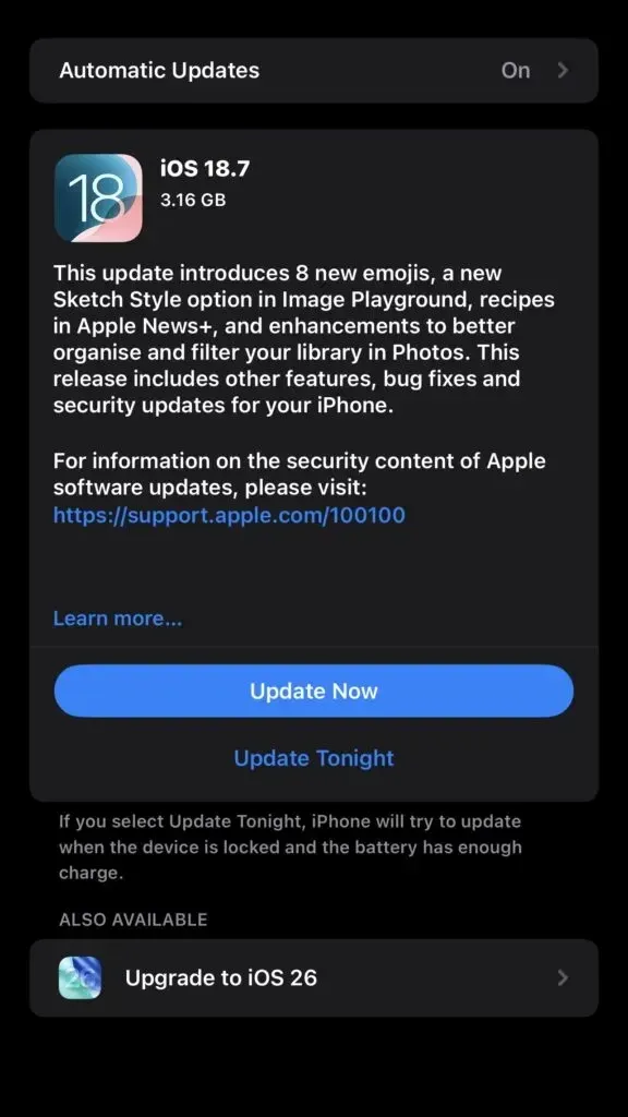 Not ready to jump into Liquid Glass? Apple’s got you covered. iOS 18.7, released alongside iOS 26, is a more traditional update focused on security patches and bug fixes. It keeps your interface exactly as it is, making it ideal for users who prefer stability over style or whose devices aren’t compatible with iOS 26.